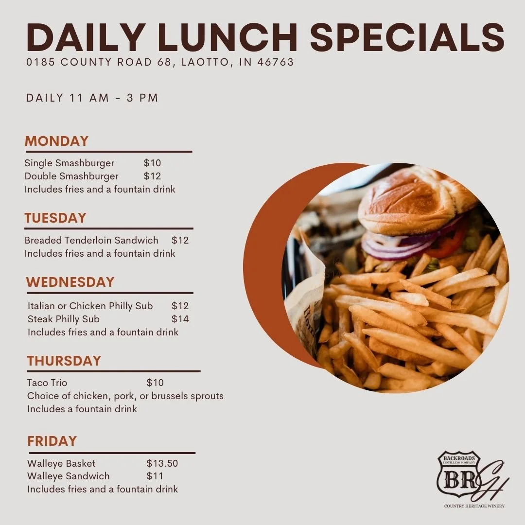 Are you looking for a new lunch spot? Come visit Country Heritage in LaOtto! You can come get quick lunch with a view! Our full kitchen opens daily at 11 am. Lunch Specials are available Monday-Friday 11am-3pm.